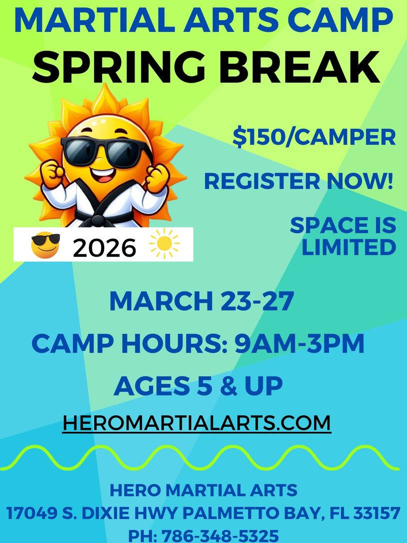 Early registration special for one camper at the 2026 Hero Martial Arts Spring Break Camp. One week camp March 23-27.